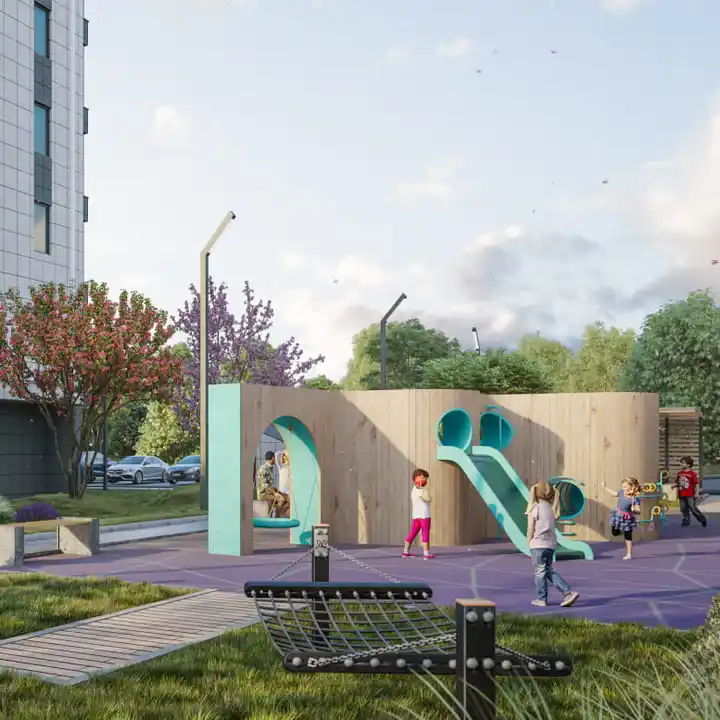 Территория комплекса благоустроена. Во дворах расположены игровые площадки с тактильным покрытием, спортивные площадки с тренажерами, футбольное поле, зоны отдыха. На первых этажах находятся коммерческие помещения. Для владельцев автомобилей предусмотрен двухуровневый подземный паркинг и наземная стоянка.